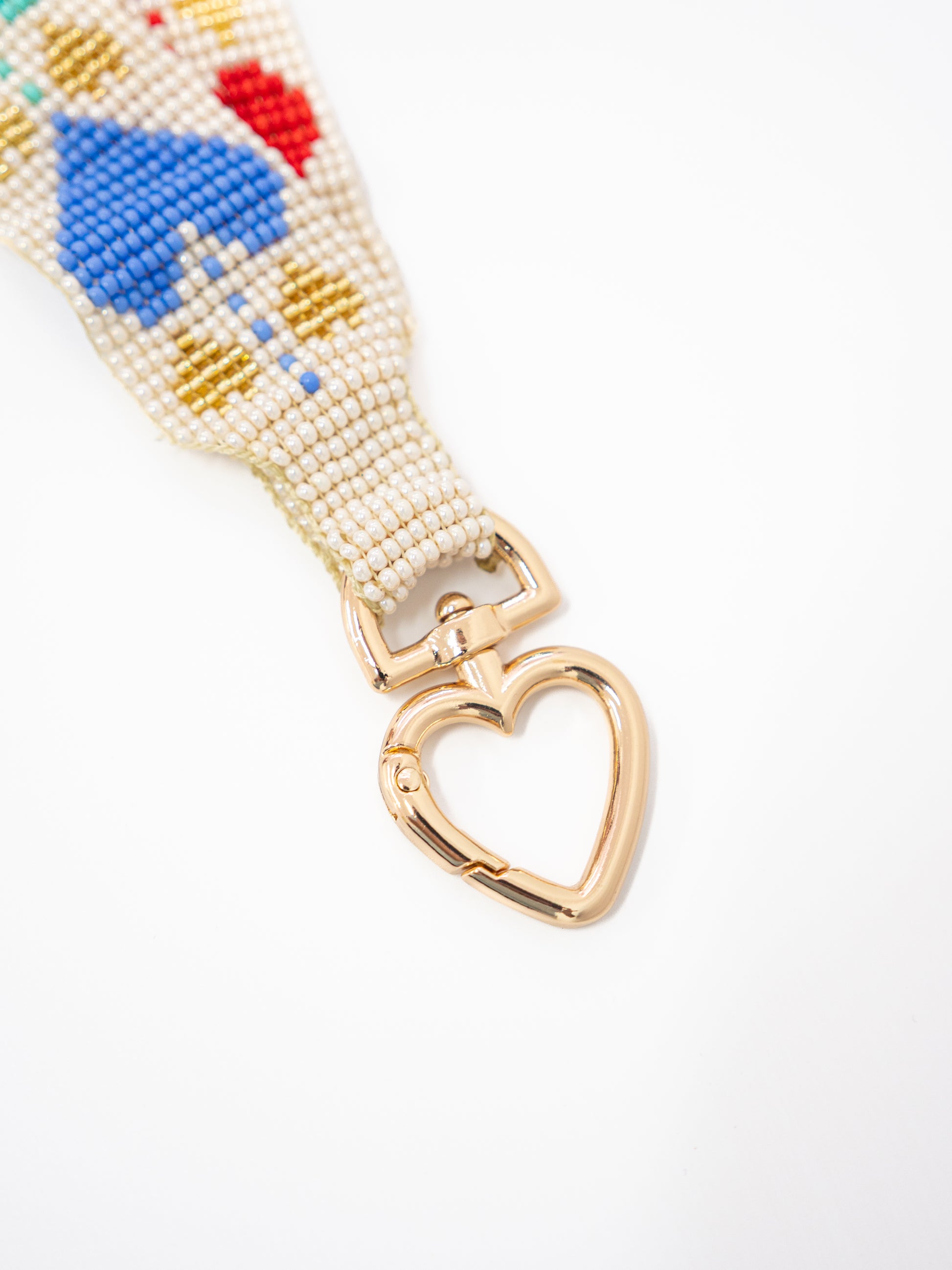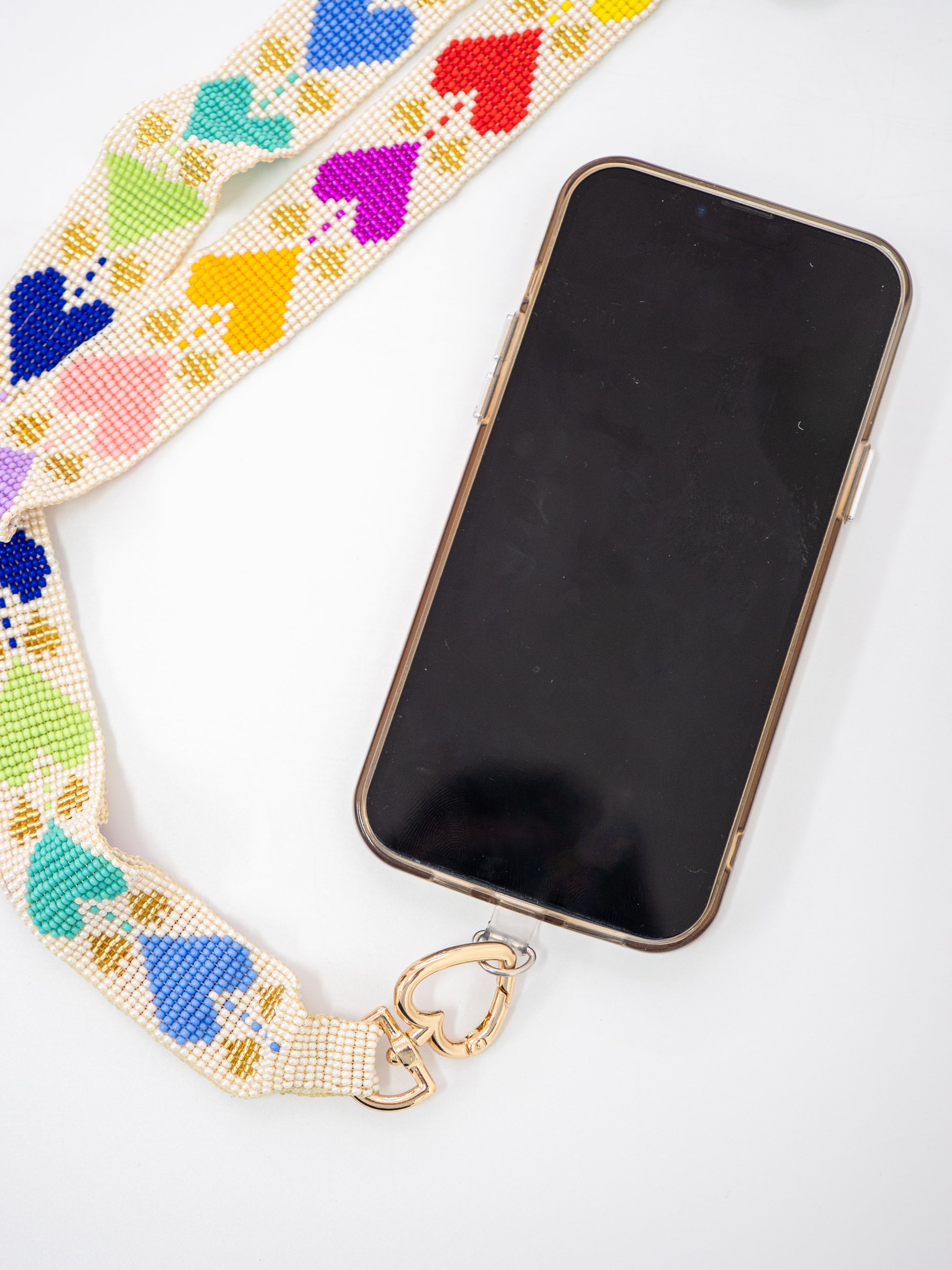 Hermoso portacelular tejida en telar con mostacilla checa, tiene un diseño de corazones multicolores en toda su longitud y está terminado con un broche en forma de corazón dorado.